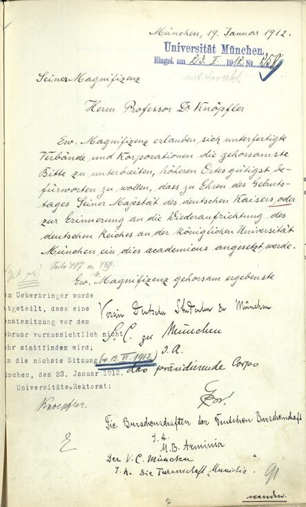 Die Idee zur Abhaltung einer Feier in „Erinnerung an die Wiederaufrichtung des deutschen Reiches“ wurde nicht innerhalb der Professorenschaft der Ludovico-Maximilianea geboren, sondern ging auf einen Vorschlag der verschiedenen Studentenverbindungen zurück. Der Senat lehnte es gleichzeitig entschieden ab, den Geburtstag des deutschen Kaisers zu feiern.